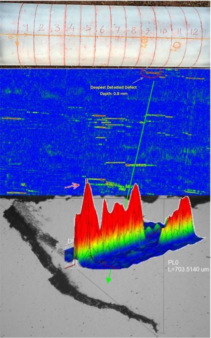 Fast detection and discrimination of  defects with Full Tracable Data Recording. Following photograph showing  300NB petroleum pipe with several surface opening discontinuties. Colour palleted image shows plan view of the circumferential surface of the pipe, 3D model of the crack showing variation in crack depth and the confirmed crack depth by microstructural examination. Flexible probe as shown below was used on the ferrous steel surface.